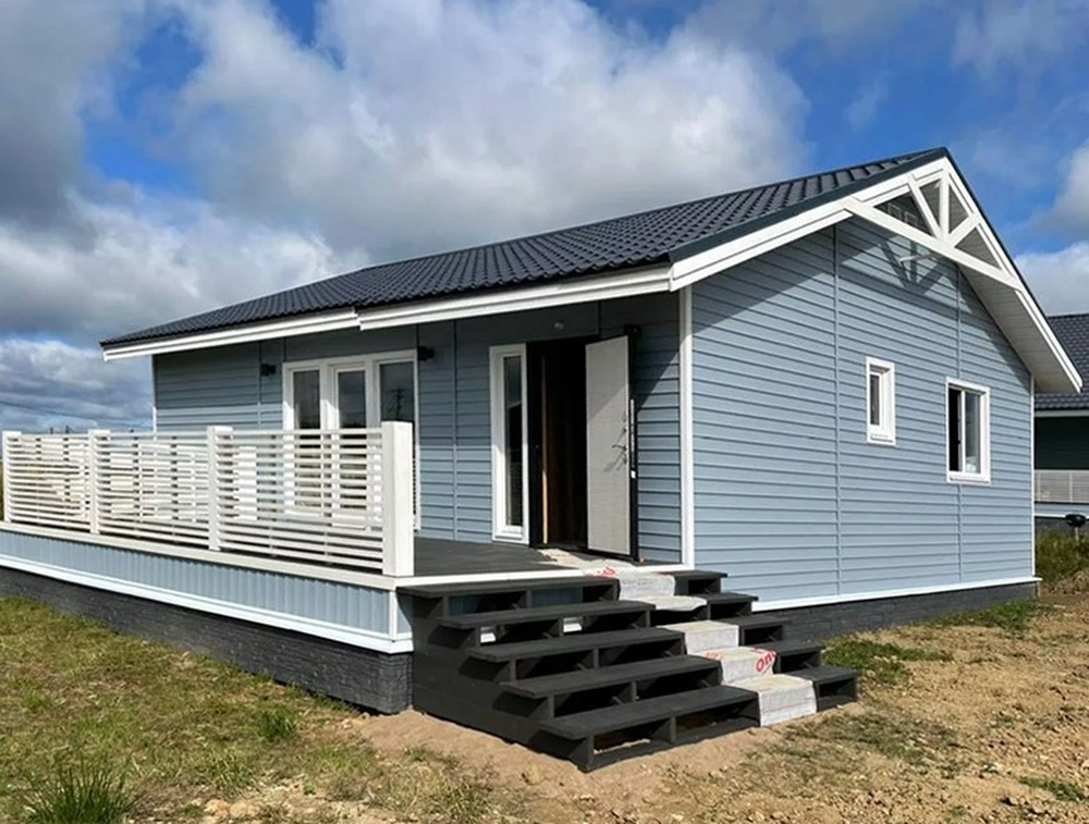 Красивый холодный оттенок в скандинавском стиле напоминает о красках северной природы. Благодаря геометрии профиля «ёлочка» сайдинг отлично имитирует отделку окрашенной вагонкой – визитную карточку скандинавской архитектуры. Сложный серо-голубой цвет приобретает особую глубину в сочетании со светлыми наличниками, углами и карнизами.