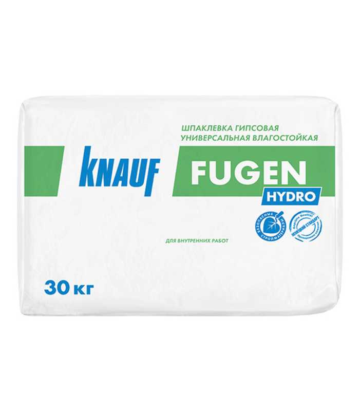 • Шпаклевка гипсовая влагостойкая КНАУФ-Фуген Гидро разработана для заделки стыков влагостойких КНАУФ-листов (ГКЛВ) и монтажа гипсовых влагостойких пазогребневых плит